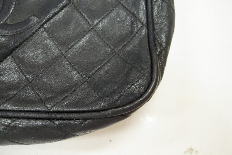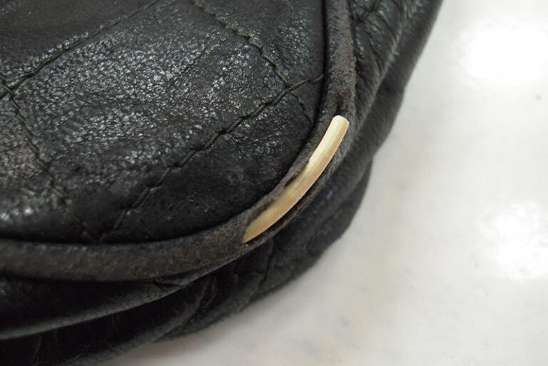 マトラッセのチェーンショルダー。角が擦り切れてしまいパイピングの中芯が見えてしまっていますが、この程度なら多少の段差は出るものの部分的な張り替えで修理可能です!